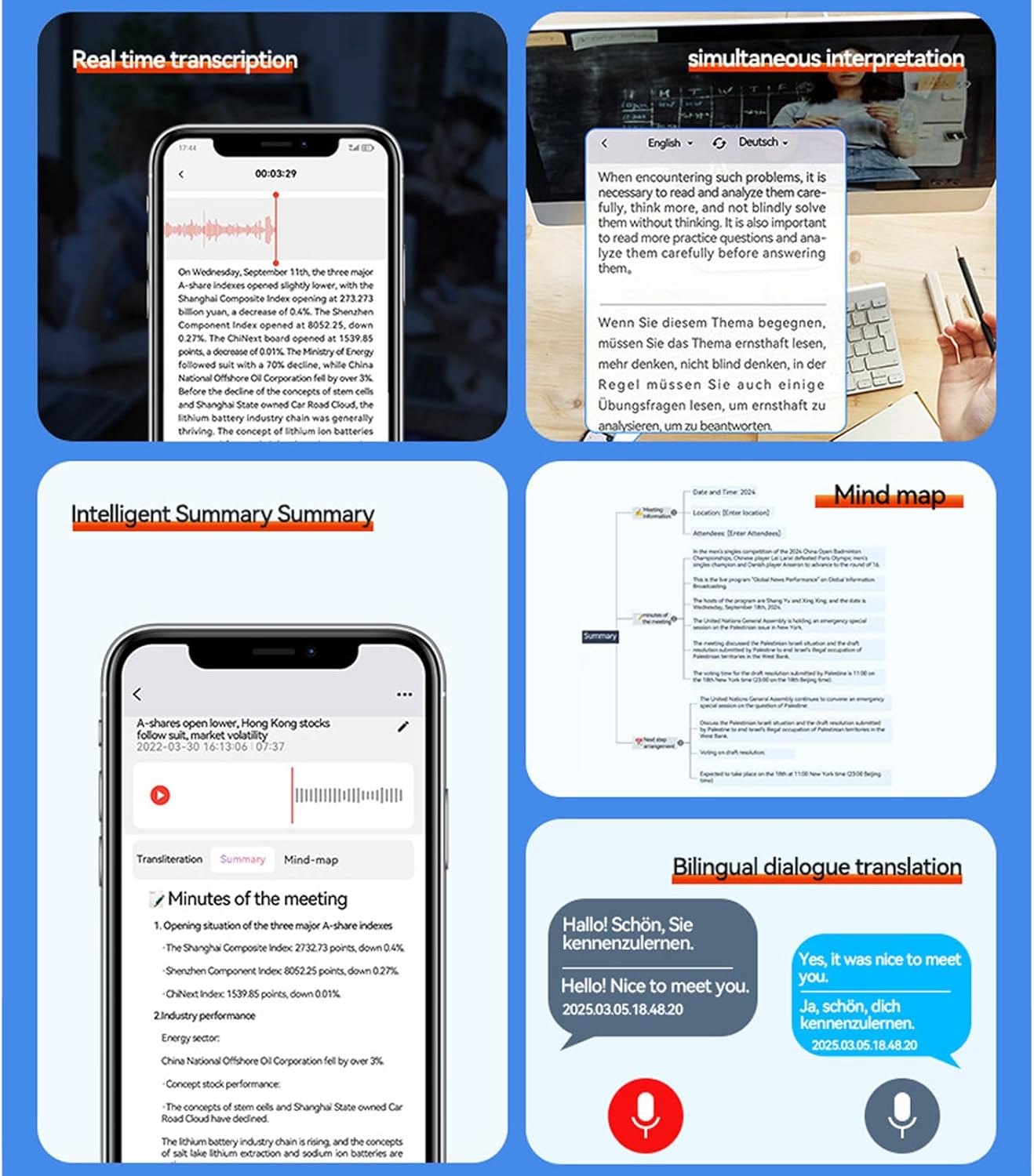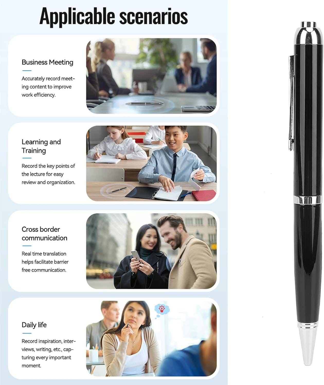 Çok Dilli Tercüme: Bu ses kayıt aleti, çeşitli dillerde anlık çeviri sağlayan bir dil eğitim destek aracı olarak işlev görmektedir. Küresel iletişimi iyileştirin ve kesintisiz iş görüşmelerini destekleyin.